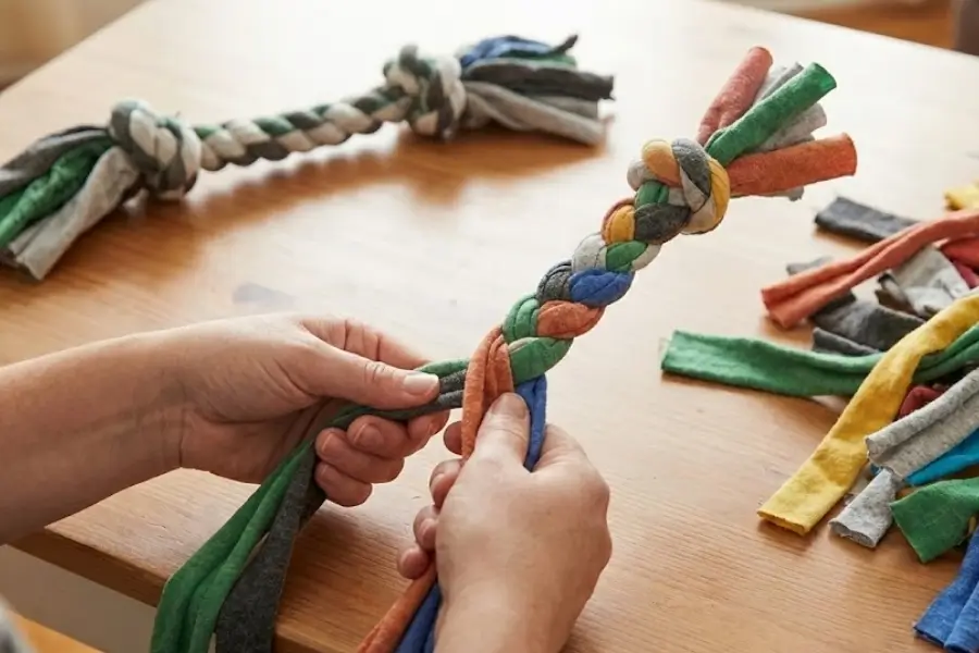 – DIY Tug/Chew Toys: Old t-shirts or denim jeans can be braided into sturdy tug toys. Old tennis balls are great for fetch. Just ensure no loose threads or pieces can be ingested.